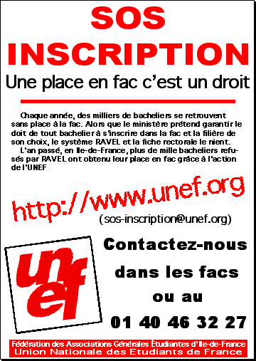 Pour contacter les AGE de l'UNEF présentes sur le Web UNEF Paris I UNEF Paris IV (AGEPS) UNEF Paris XII AGEE-UNEF (Evry)UNEF Arras UNEF Caen (ACE) UNEF Dijon (UGED) UNEF Lille (AGEL) UNEF Lyon UNEF Montpellier (UGEM) CEN-UNEF (Nantes) AGER-UNEF (Rouen) national@unef.org *** Forum de discussion |