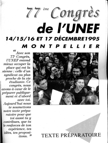 77e congrès, Montpellier, 14 au 17 décembre 1995 Le texte préparatoire. La contribution de lACE-UNEF (Caen) Trois comptes-rendus contradictoires de ce congrès, internes à lAGE-UNEF Sciences Po. Marie-Pierre Vieu est réélue présidente, Marie-Noëlle Bertand réélue secrétaire générale, Géraldine Souloumiac élue trésorière, Bob Injey élu président de la Commission de contrôle. |