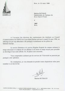 ![]() Un courrier dŽsagrŽable ˆ propos d'un collage ˆ Bron pour les Žlections du CROUS 1996 Commentaire de RŽmi Fourche en 2020: "Je me souviens de ce collage nocturne. Il Žtait exceptionnel. Du grand art. Nous Žtions ˆ la limite de mesurer les hauteurs par rapport au sol pour que tous les piliers de ce b‰timent sur pilotis soit bien couverts de faon symŽtrique, et tout autour du pilier. Sans compter les fentres de l'administration centrale ! Il y avait mme un camarade sur le toit du b‰timent pour surveiller l'arrivŽe Žventuelle de la marŽchaussŽe. Je me souviens aussi de m'tre rŽpandu en excuses et explications dŽbiles auprs de l'administrationÉ.Mais nous n'avons ni payŽ ni enlevŽ les affiches !!!" |